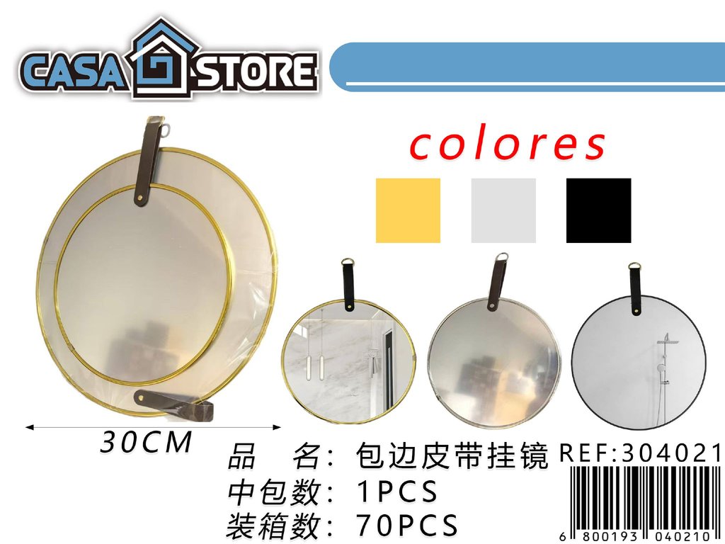 láminas de espejos con correa de cuero y argolla para colgar en tonos dorado y plateado.